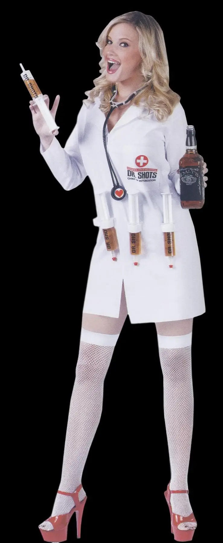 Lab coat with 4 syringe loops and screened logo front, hook and loop tab closure, 4 large syringes, and stethoscope. Great for parties! Bottle not included. One size fits women sizes 2-8.