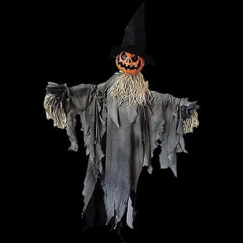 Distressed worn ashy colored robes raggedly hang from the corpse of a wicked scarecrow. Straw protrudes from its hand and neck openings in a natural way giving it an aged appearance. It sits on an easy-to-assemble 4-pronged stand with 3 interlocking poles that hold it upright. The sound activation option included is sure to catch even the most warry off guard for a surprise scare. Being battery-powered allows the Scarecrow to easily be placed almost anywhere inside and in sheltered outdoor areas. Come see what all the screams are about!