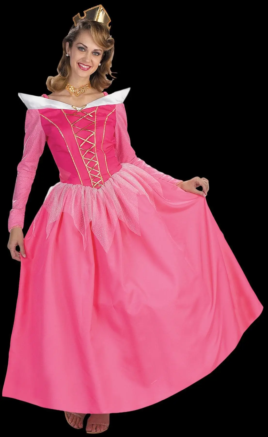 Deluxe costume with elegant pink dress, choker and tiara. Fits up to size 14. Shoes not included.