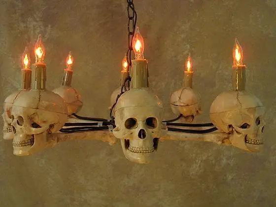 This well constructed skull chandelier, made with eight medium size skulls in a wagon wheel fashion, would be great for any Halloween or Horror event. It is made in a wagon wheel fashion that is 23″ across and just about 8″ high. This chandelier is great for a low ceiling. The hanging weight is just about 13 pounds.