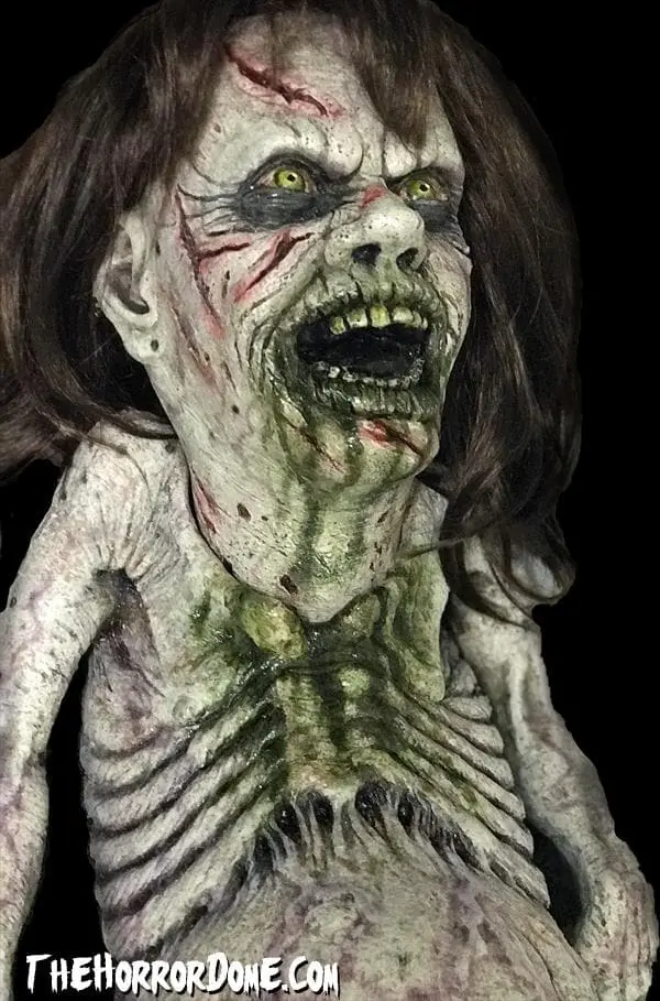Possessed by a demonic entity, this poor soul is rotten to the core. Despite being separated from her Mother, she refuses to die. With menacing, bloodshot eyes, slashed leathery skin, and a grotesque mouth dripping green bile, this Exorcist Baby curses the unlucky few who cross her path. Perfect for any haunted house, the Possessed Baby puppet Halloween decoration is a finely detailed prop that looks eerily realistic. Hand painted and produced by the experts at The Horror Dome, with movable mouth, head and arms, this puppet will give nightmares to the local trick or treaters. Pair this puppet with an adult Zombie costume and compete a ferocious family unit.
